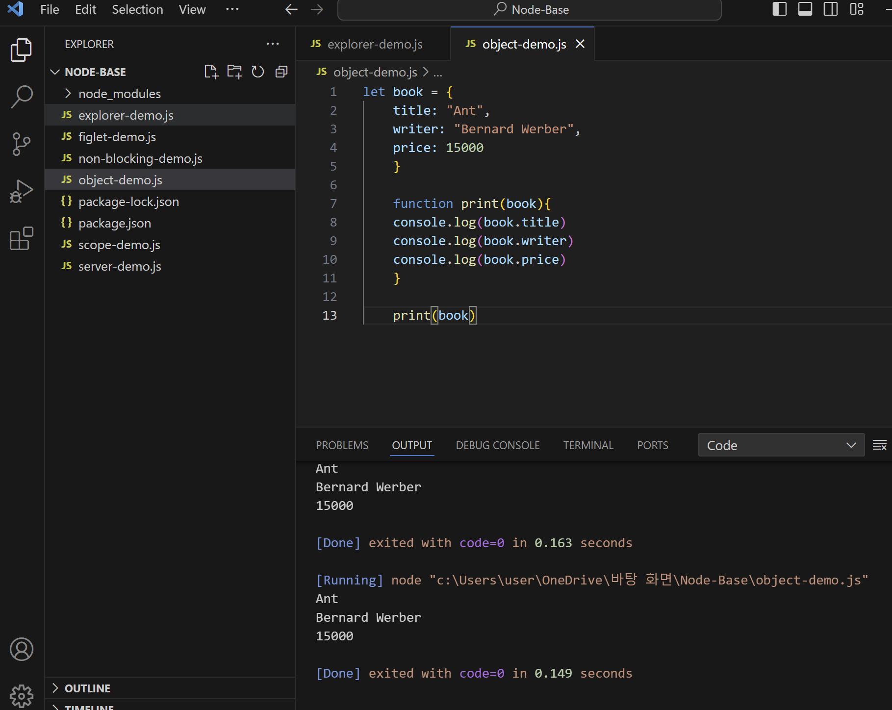 새로운 파일 object-demo.js를 만들어 객체를 그대로 표현하고 출력해보자.