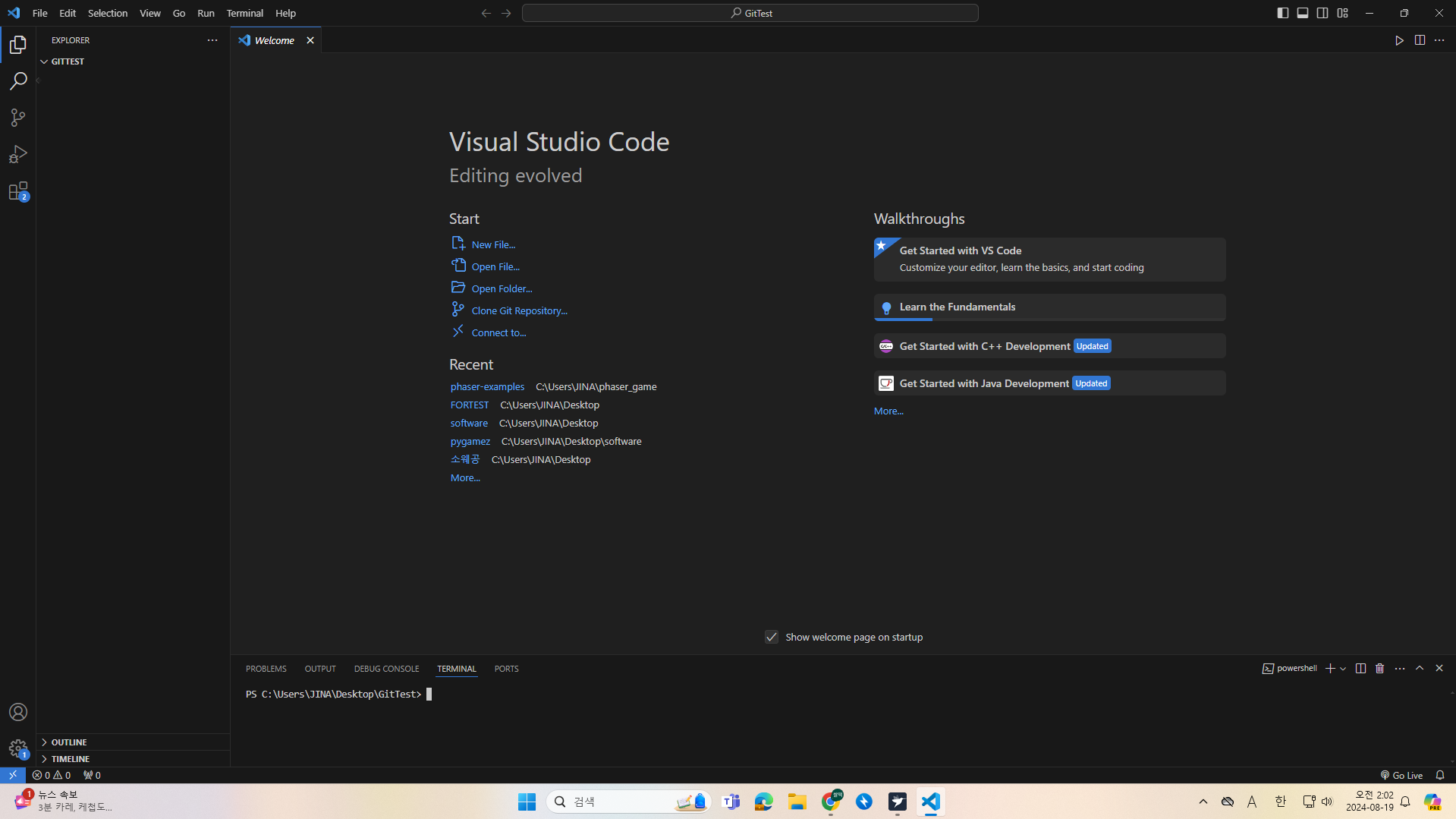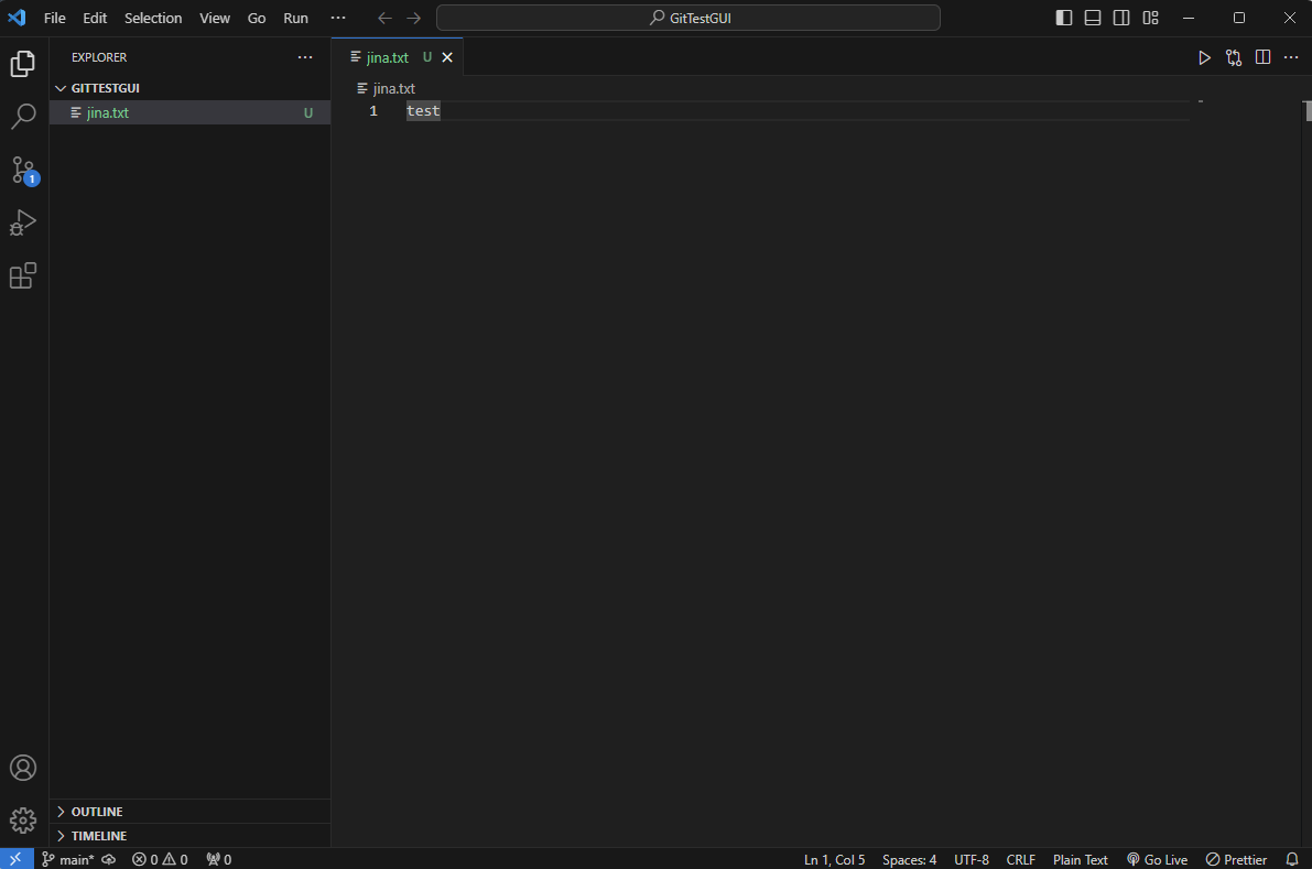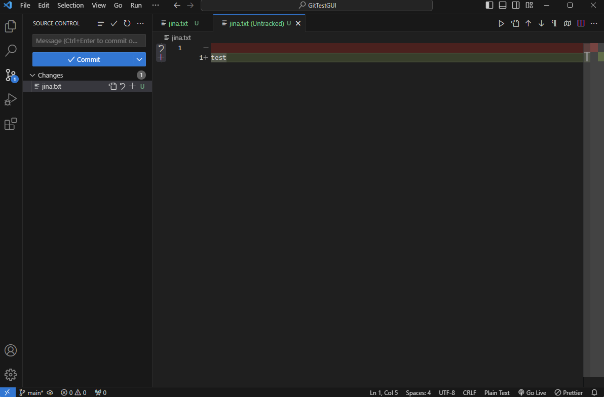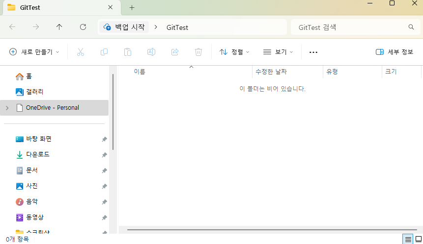 위 실습에서는 terminal(CLI)로 글자 하나하나 입력하면서 git명령어들에 대해 알아봤다. 그러나 사실 이럴 필요 없이 vs code에서 제공하는 버튼들로 간단히 확인할 수 있다(GUI) 😵😵😵. 실습을 위해 GitTestGUI라는 이름의 새로운 폴더를 생성 후 불러왔다.