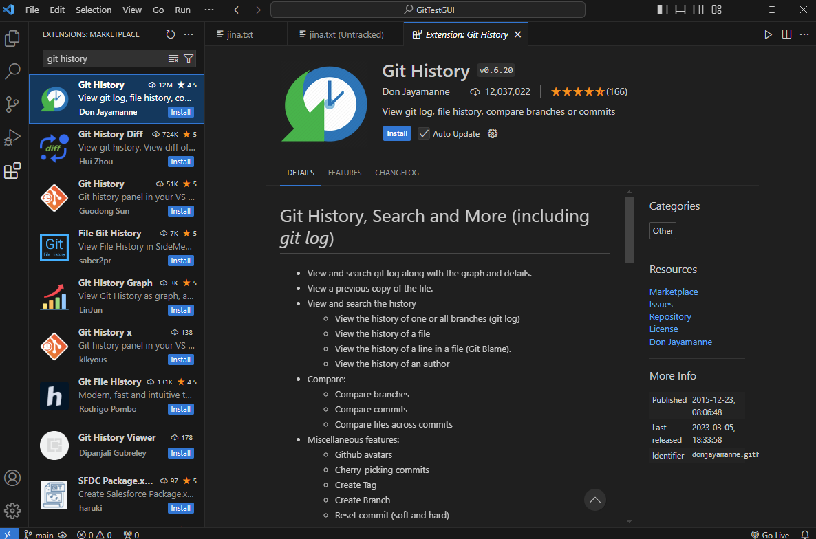 git history를 검색창에서 검색해 install해준다.