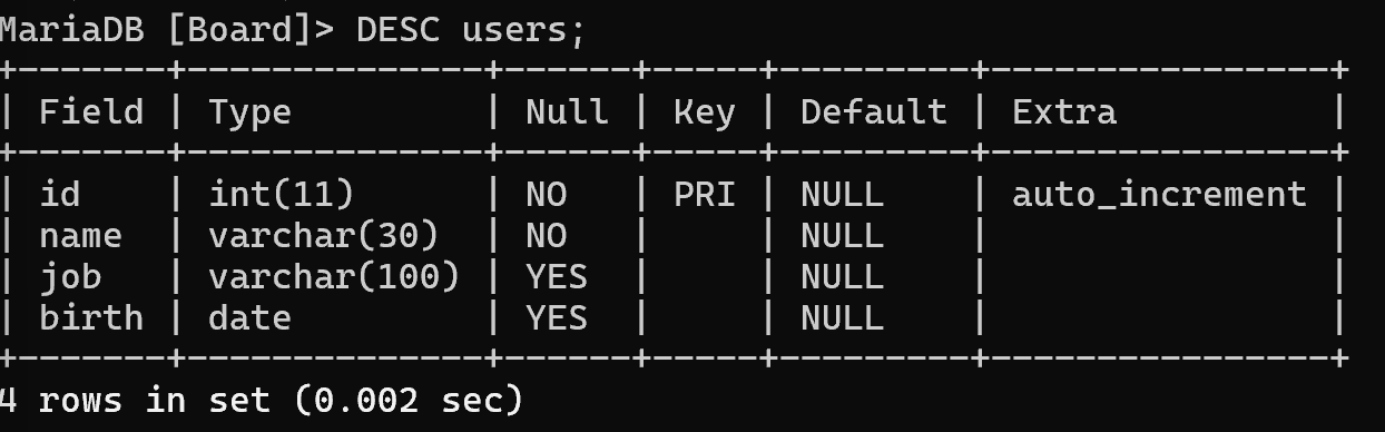 AUTO_INCREMENT를 넣어 테이블에 값 입력시 id값을 주지 않아도 자동으로 숫자가 증가한다.