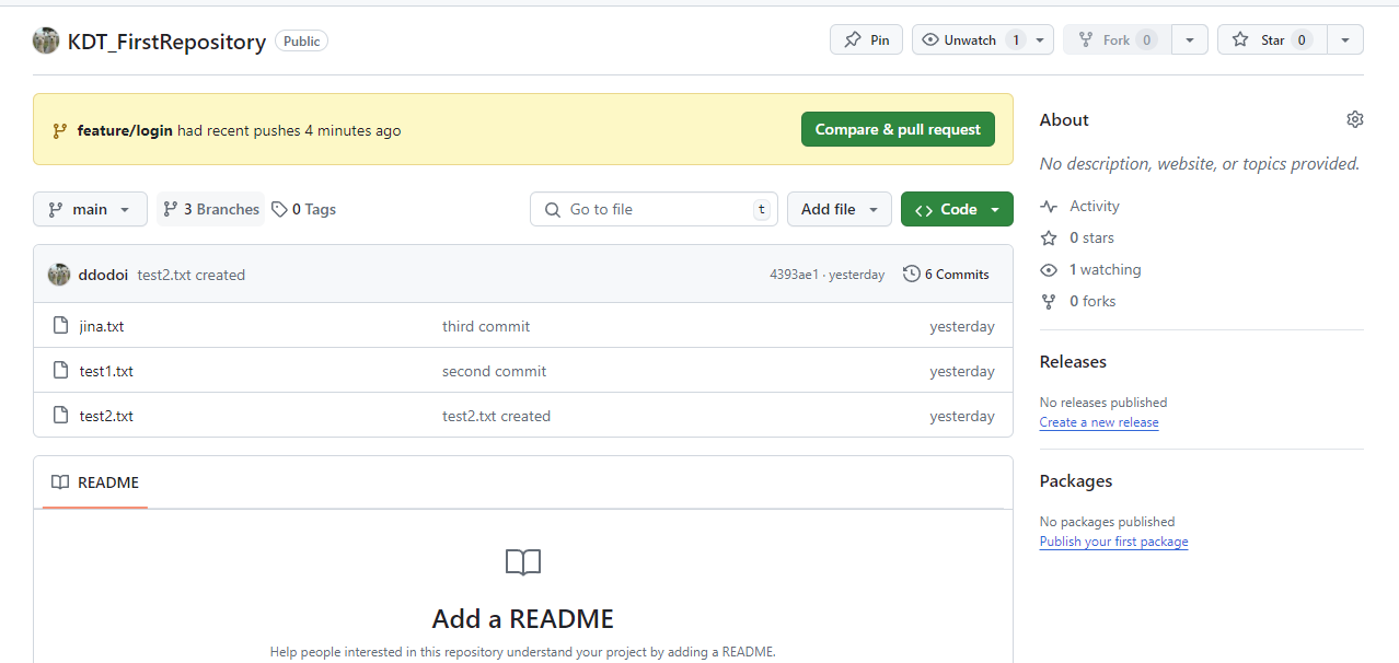 여기서 main버튼을 눌러 feature/login브랜치로 들어가보자.