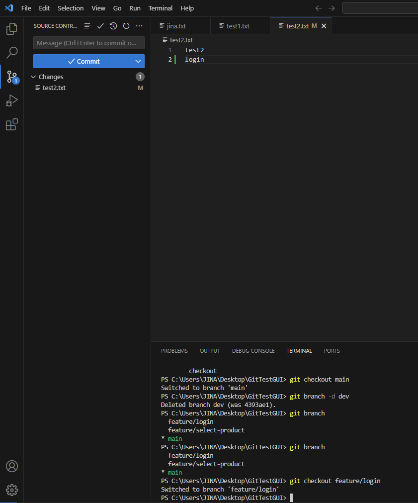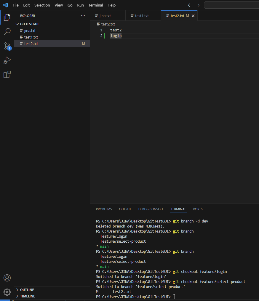 feature/login브랜치에서 test2.txt파일에 적었던 login문자가 사라진 것을 확인할 수 있다.