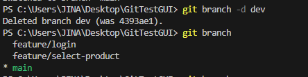 git branch -d 브랜치명: 해당 브랜치를 삭제한다.(단 해당 브랜치에 유저가 있으면 안되고 다른 브랜치로 이동 후 삭제 가능)