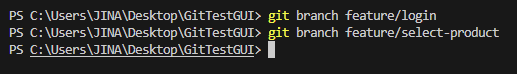 브랜치를 한번 만들어보자. 2개의 브랜치 feature/login과 feature/select-product을 만들었다.