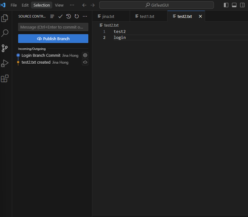 git feature/login브랜치로 이동 후 test2.txt파일에 login이라는 문자를 추가해주었다. 병렬이라면 다른 브랜치로 이동시 해당 문자를 추가한 것이 반영 되지 않을 것이다.