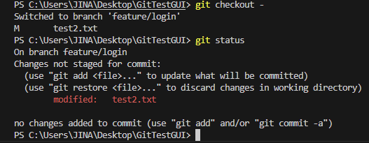 이번에는 다시 이전 feature/login브랜치로 돌아와 상태를 확인해보자. 여기에도 파일이 수정됐단 알림이 보인다.