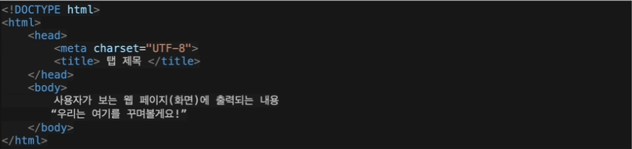 HTML은 <>괄호를 사용한다. 우리는 이걸 태그라고 부른다. 태그는 웹 페이지의 구성 요소 하나하나로 역할을 하게 된다.