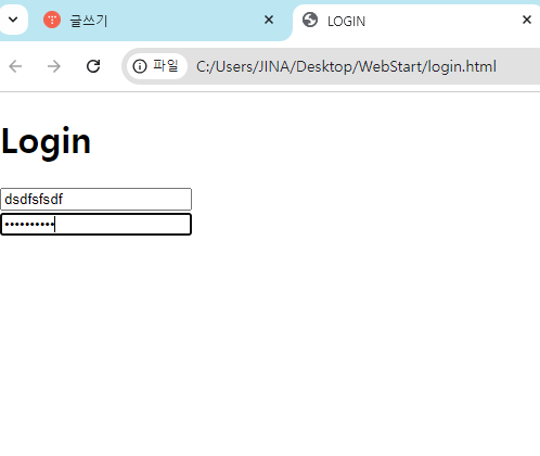 실행시키면 <input type="text">태그에는 문자가 입력되고, <input type="password">태그는 실제 비밀번호 입력을 받는 것처럼 입력한 값이 보이지 않는다.